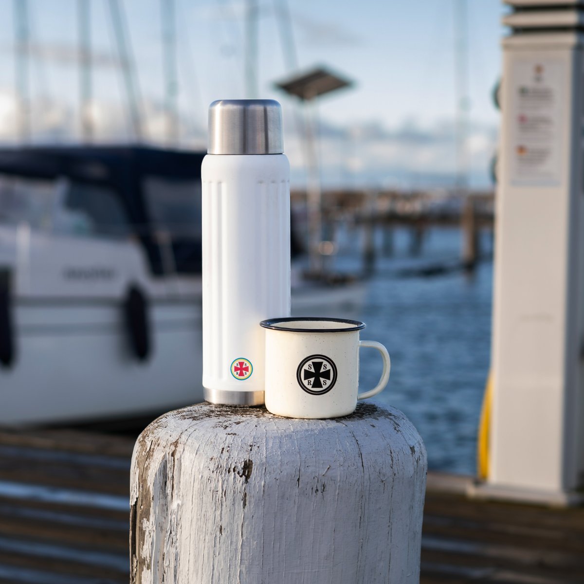 Vit termos med matt yta och Sjöräddningssällskapets bildmärke. Termosens greppvänliga struktur gör den lätt att hålla, både med och utan vantar. Försluten med isolerad skruvkork. Tål ej maskindisk.